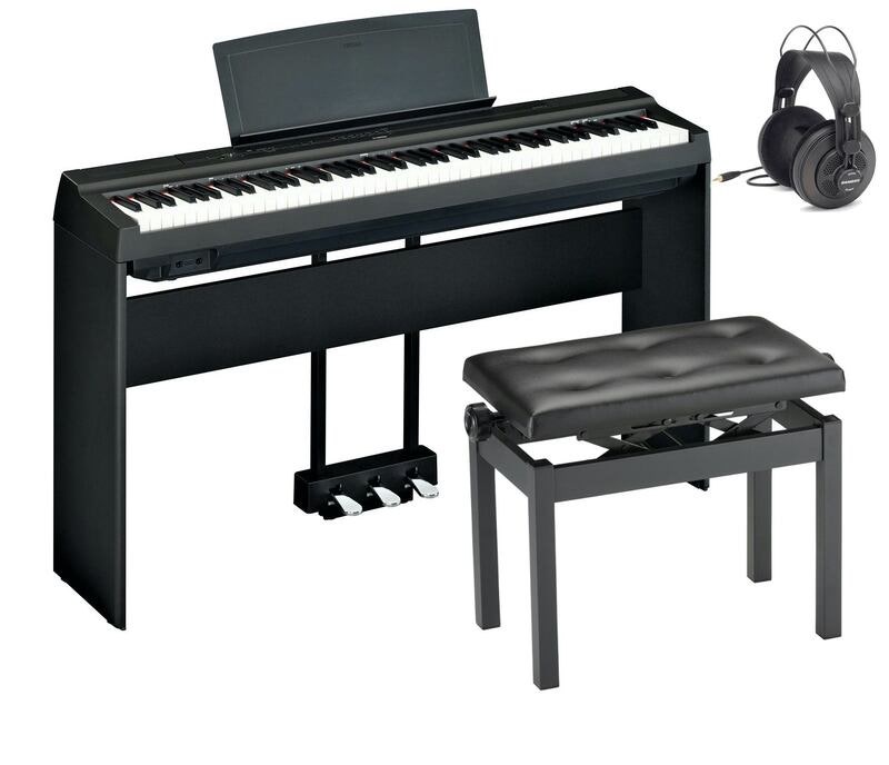 Sisältää P125BK-digitaalipianon, puisen jalustan, kolmen pedaalin pedaaliyksikön, Profile HY-PJ023-BK-pianotuolin sekä Samson SR850C-kuulokkeet
