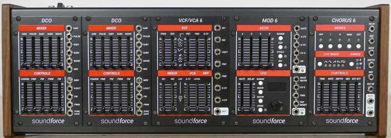 Tuotenumero 1092534A 84HP juno-style modular voice in its custom sheet metal case including power and walnut side panels.