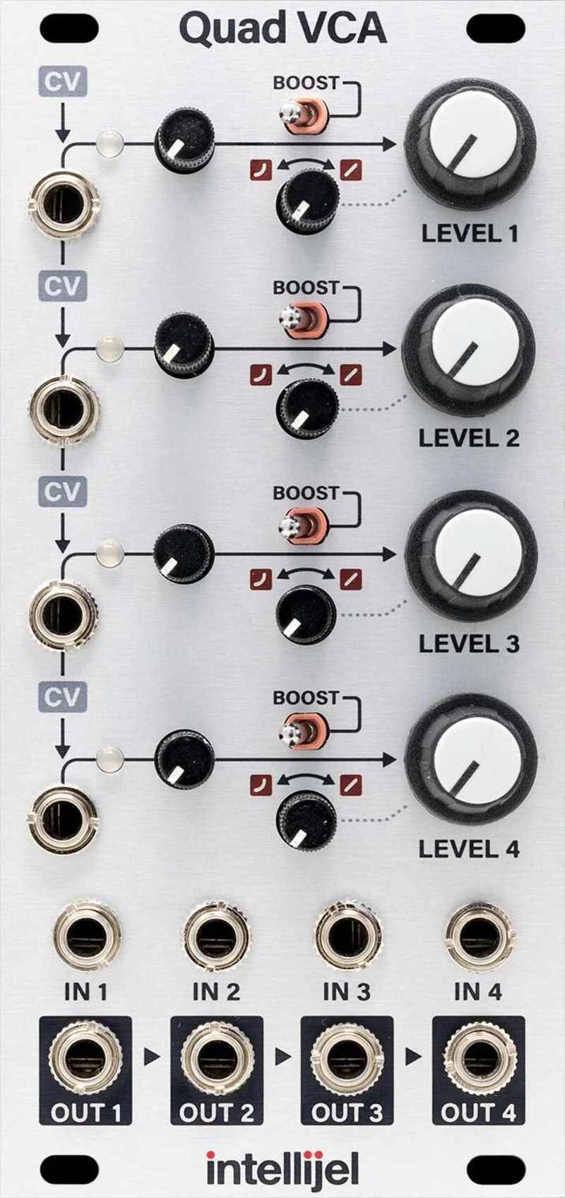 Intellijel Quad VCA on 4-kanavainen VCA- ja mikserimoduuli, jossa on CV-vaimennus, vasteen säätö, signaaliketjutus ja boost-toiminto – täydellinen dynaamisen kontrollin keskus Eurorack-järjestelmään.