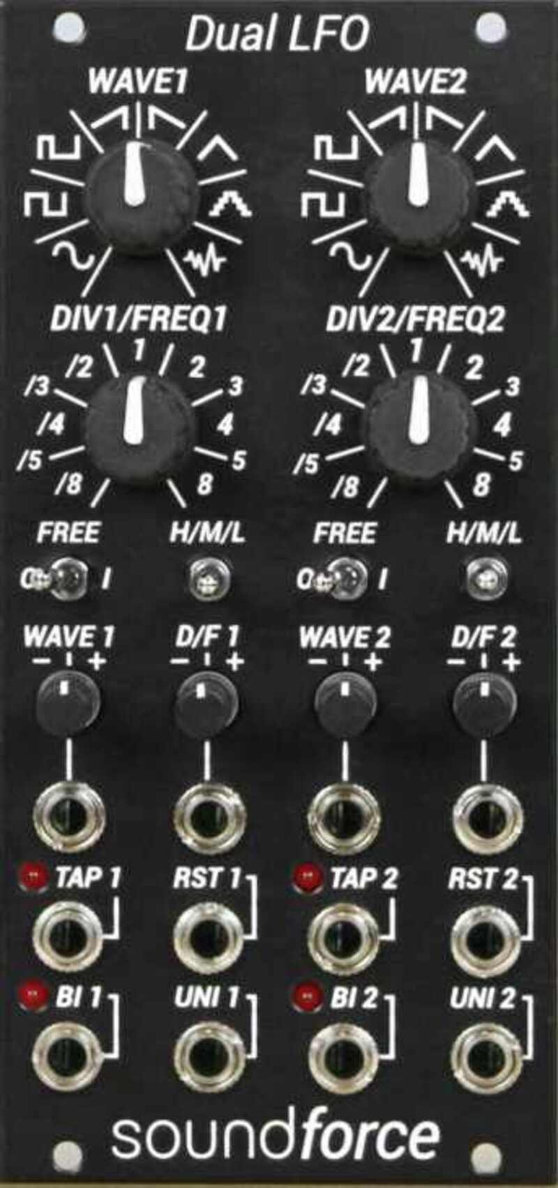 SoundForce Dual LFO on 12HP leveä kaksikanavainen LFO-moduuli, joka tarjoaa sekä vapaasti toimivan että ulkoisesti synkronoitavan toimintatilan. Se perustuu tehokkaaseen STM32-ohjainpiiriin, ja se on suunniteltu erityisesti luoviin ja rytmisiin modulointitarpeisiin.