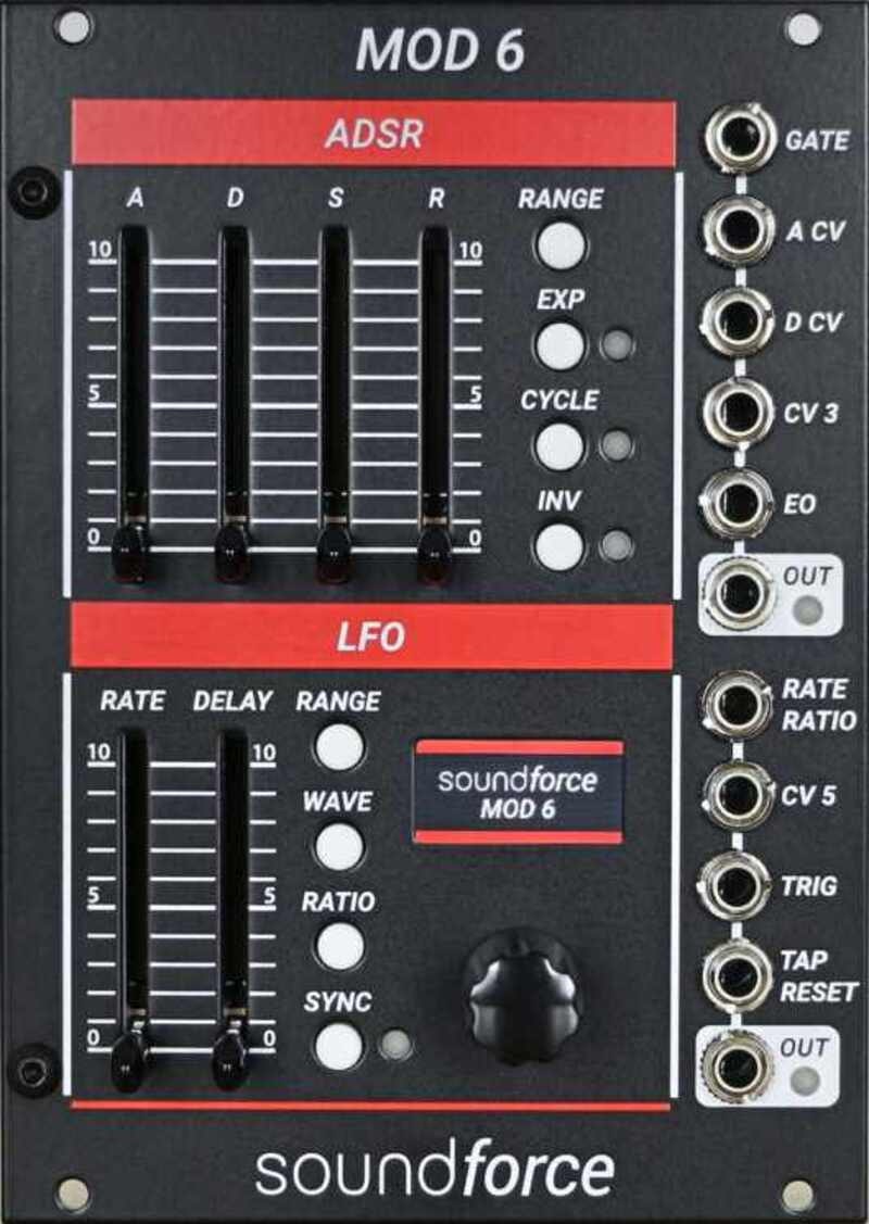 SoundForce MOD 6 Black on 18HP leveä digitaalisesti ohjattu ADSR- ja LFO-moduuli, joka on suunniteltu erityisesti täydentämään SoundForcen Juno-henkistä moduulisarjaa (DCO, VCF/VCA 6 ja Chorus 6). MOD 6 tarjoaa laajat säätömahdollisuudet ja huippuluokan käyttöliittymän LCD-näytöllä ja enkooderilla.