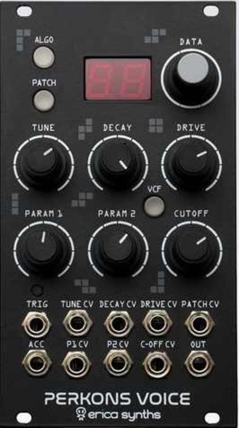 Erica Synths Perkons Voice is a eurorack incarnation of the percussion voices from the PERKONS HD-01 Drum machine. Like on the drum machine, the module has hybrid architecture, featuring a digital sound engine followed by an analogue multimode filter and overdrive. Users can select among 13 sound generation algorithms and save up to 99 presets that can be recalled easily. Tune and Patch CV inputs are configurable for various CV settings and are tuned to 1V/oct. Module also features a 4-voice poly overlap mode and samples on the "Rompler" engine can be easily replaced.