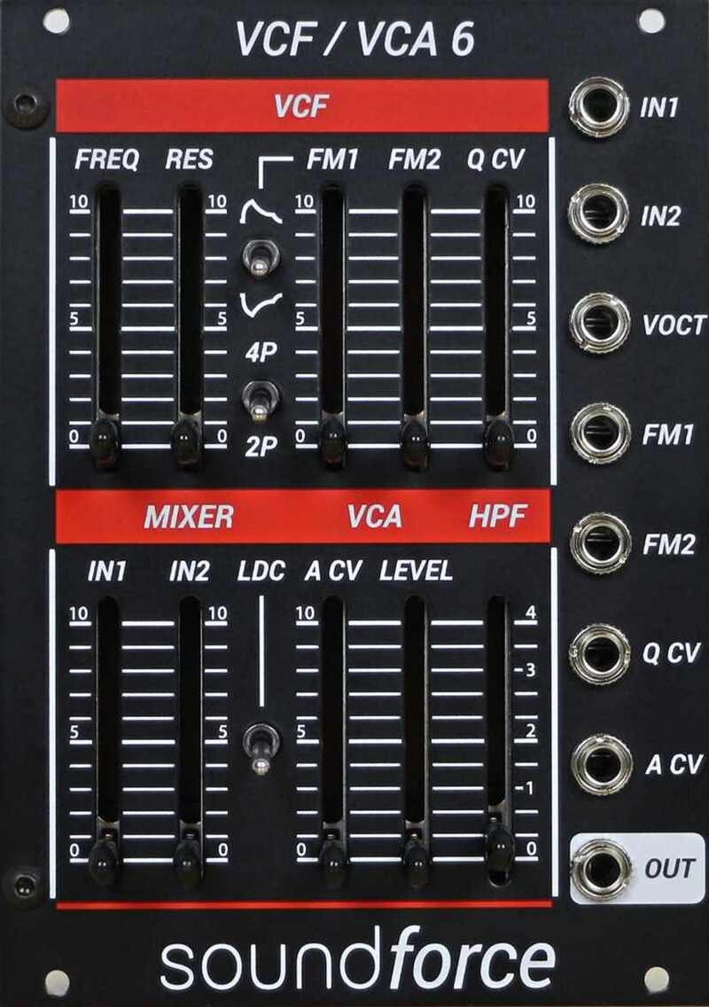 SoundForce VCF/VCA 6 Black on 16HP Eurorack-moduuli, joka yhdistää klassisen Juno-syntetisaattorin 24dB/okt low-pass -suodattimen ja sen perään sijoitetun VCA:n yhdeksi tehokkaaksi yksiköksi. Moduuli on suunniteltu tarkasti vastaamaan legendaarista Roland Juno 60/106 -soundia sekä suodattimen että VCA:n osalta.