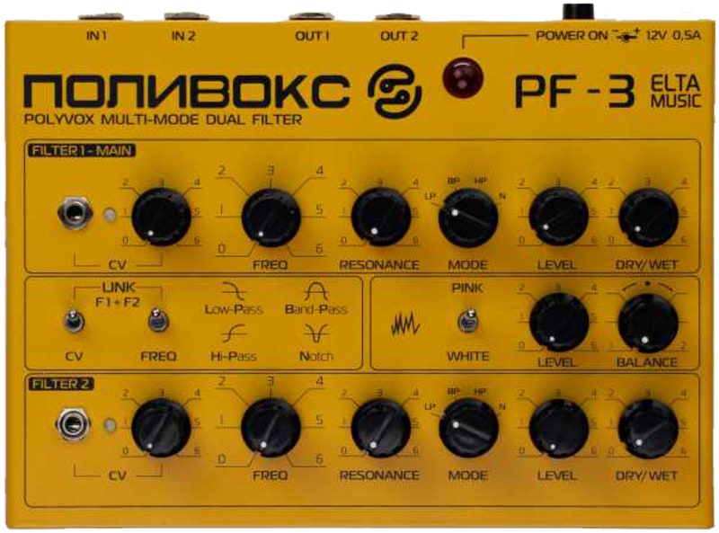 The PF-3 mk.2 is a stereo analog filter with four different filter modes onboard: lowpass, bandpass, highpass, and notch. These are available on both channels, it’s a stereo processor. You can link both filters with a switch so you can control two filters and CV simultaneously with a single knob.