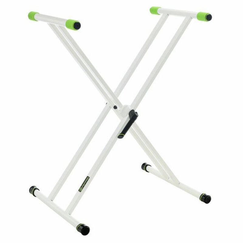 Tuotenumero 1075389Tuplaristikolla varustettu tukeva X-mallinen kosketinsoitinteline, valkoinen