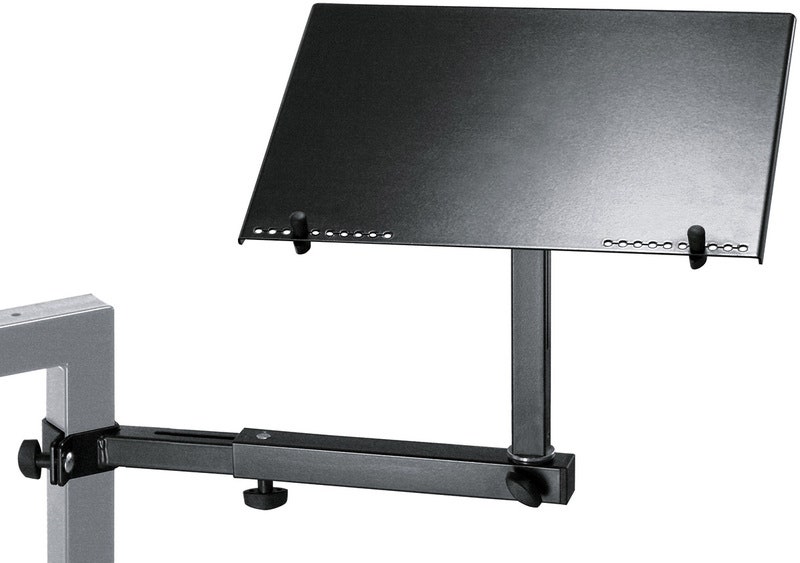 Tämän Omega 18810-, 18950- ja 18953-kosketinsoitintelineille suunnitellun telineen avulla saat kannettavan tietokoneesi lähelle ja käsiesi ulottuville vaivattomasti. Tätä monipuolisempaa kannettavan tietokoneen pidikettä et taatusti löydä. Voit kallistaa tasoa kahdeksan eri säätöportaan avulla ja voit kiinnittää lisäosan mihin tahansa neliön muotoiseen putkeen (mitat n. 40mm x 40mm). Säädettävien pysäytystappien ansiosta kannettavan tietokoneen liitännät ovat aina helposti saatavilla. Tukihylly soveltuu myös pienille laitteille, kuten iPadille ja rumpukoneille.