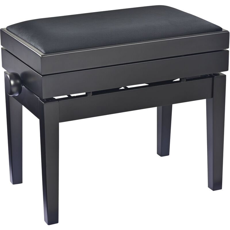 Tämä klassinen pianopenkki on valmistettu massiivipuusta, viimeistelty mattamustaksi ja verhoiltu mustalla samettikankaalla. Tuolin istuinosaan on integroitu kätevä nuottien säilytystila. Korkealaatuisista materiaaleista ja nykyaikaisella tekniikalla valmistetun penkin korkeutta voidaan säätää helposti, jotta soittajalle saadaan ihanteellinen istuma-asento.