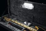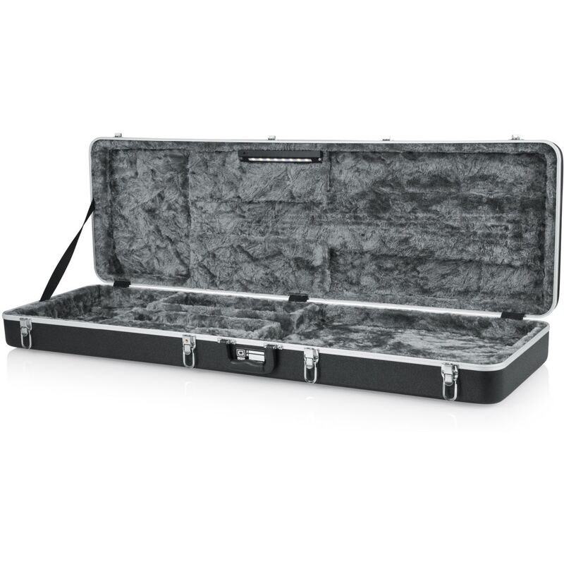 A hard case for electric bass guitars, made from impact-resistant ABS plastic designed to protect against bumps, dust, and dirt. The interior features precision-molded EPS foam padding with a plush lining to prevent scratches and damage. A built-in LED light illuminates the accessory compartment next to the instrument, making it easier to locate gear in dark environments such as backstage or on stage.
