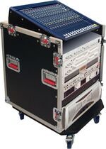 This console rack is designed to hold both mixers and standard rack-mounted audio equipment. The upper section is slanted for easy access to controls, while the lower section accommodates standard 19-inch units. Suitable for both touring and fixed installations.