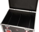 Built from 12 mm plywood with a laminated exterior and reinforced metal ball corners. The interior is lined with grey carpet to protect contents, and the hinged lid provides easy access.
