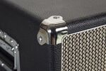 A kickstand on the bottom allows the unit to be angled upward toward the user. Spring-loaded side handles and a premium leather top handle make lifting and transport easier. Rubber feet provide stability when placed on amps, cabinets, or desks.