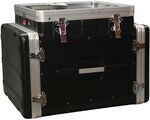This portable rack unit combines a 10U top rack with an 8U side-mounted rack in a single solution. The top section features a pop-up ratchet system, allowing it to lie flat during transport and be tilted to various angles during use.