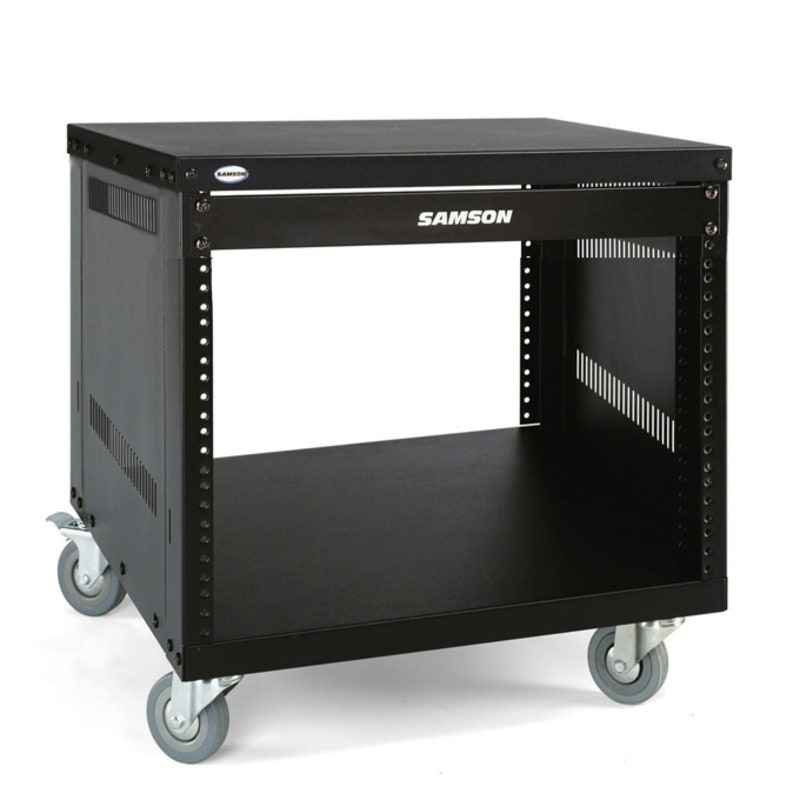 Tukeva 8U teräksinen räkkivaunu lukittavilla 75mm kumipyörillä. Räkissä on kiinnityskiskot eurooppalaisilla ja amerikkalaisilla ruuvikierteillä (eri puolilla). Räkin sivut ovat umpinaiset ja varustettu tuuletusaukoilla. Mukana 1U peitelevy.