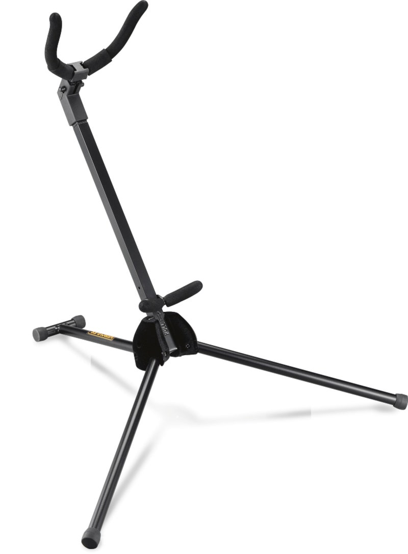 Kevyt tenorisaksofonin teline, joka taittuu kätevästi soittimen sisään kuljetuksen ajaksi