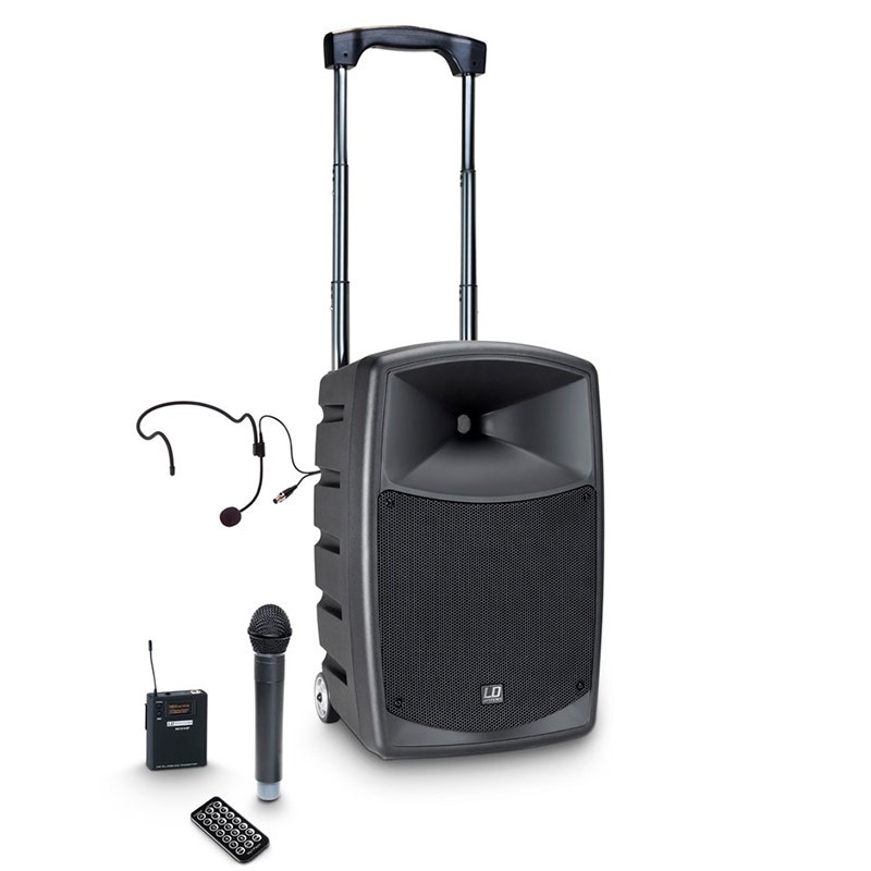 The Roadbuddy relies fully on wireless transmission: it has two UHF radio receiver who operates in the license-free 863 - 865 MHz range. The on-board Bluetooth player with backlit multifunction display ,equalizer, USB port and SD card slot supports the mp3, wma and wav formats. Two handheld microphone with 10 mW output power(LDRBUD10HHD2), two headset microphones with belt pack (LDRBUD10BPH2) or as an alternative a handheld microphone and a headset microphone with belt pack (LDRBUD10HBH2) and an IR-remote control for the player are included.