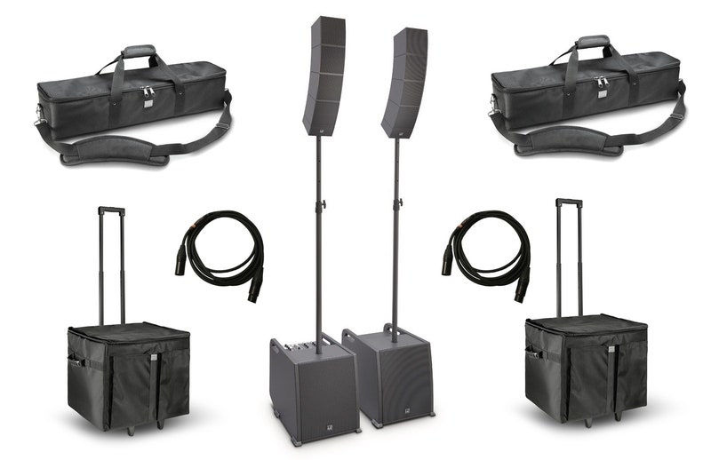 Tuotenumero 1078400Tehokas ja aktiivinen linjasäteilijäjärjestelmä bluetooth-vastaanottimella. Valmis paketti, joka sisältää kaiutintelineet, kuljetuskotelot ja kaapelit