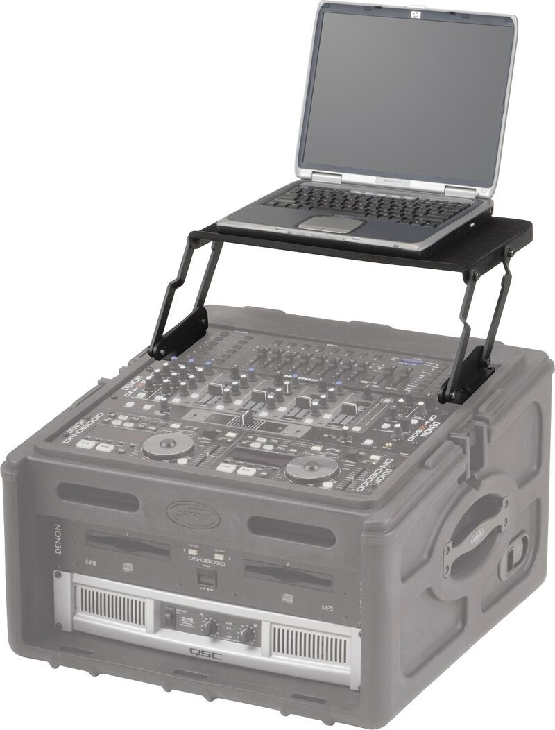 Tuotenumero 1041950SKB-AV8, hylly esim. kannettaville tietokoneille. Asennetaan räkkehiin, joissa yläpuolista tilaa vähintään 8U. Sopii esim. SKB-82DJ, SKB-84DJ ja SKB -106DJ -koteloihin