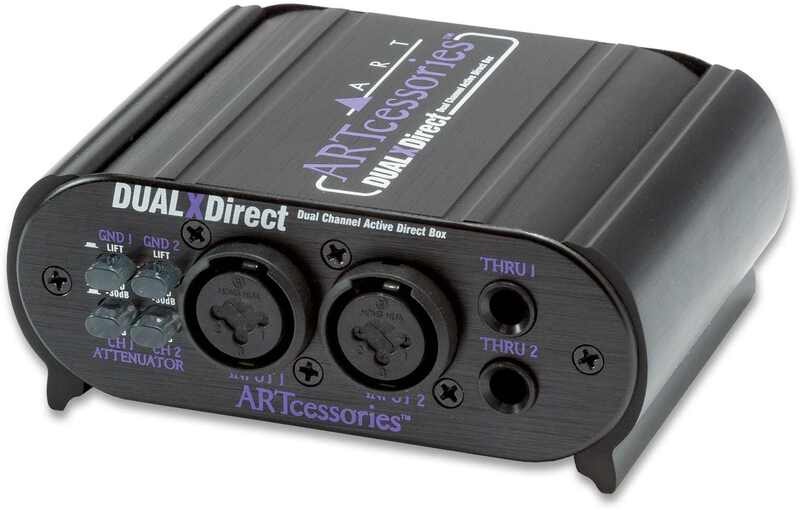 The DUALXDirect provides two independent high quality active interfaces that let you connect instrument, line, or speaker level signals to a mixer or other balanced inputs. Each of the high impedance 1/4″ and XLR inputs (provided via “combo” jacks) are buffered and converted by very low noise active electronics into an isolated, balanced, low impedance signal output. The DUALXDirect has an extremely flat and wide frequency response and can handle high signal levels. This gives the DUALXDirect a very clean and neutral sound with a wide variety of signal sources and over long signal runs in high noise environments.