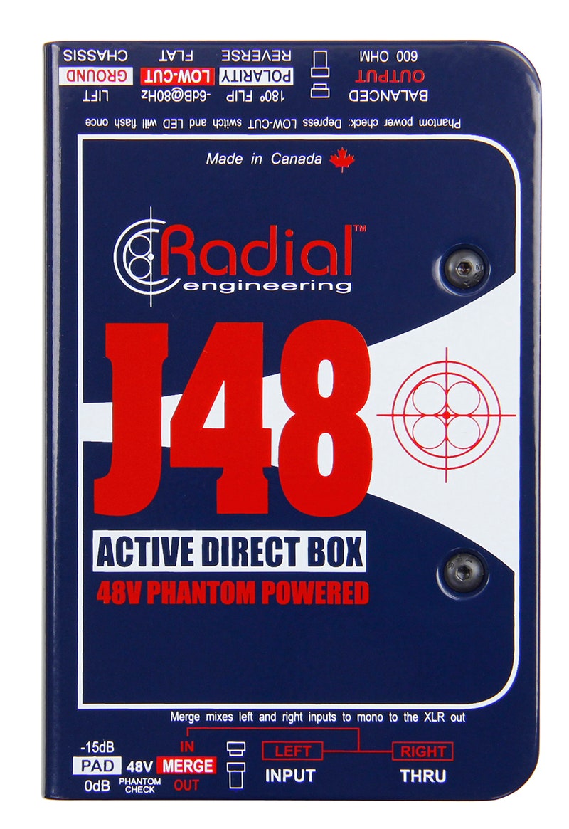 Radial J48 on suorituskykyinen aktiivinen DI-boksi, joka on suunniteltu erityisesti ammattikäyttöön sekä live-esityksissä että studio-olosuhteissa. Se toimii 48V phantom-virralla ilman paristoja ja tarjoaa poikkeuksellisen headroomin sekä laajan taajuusvasteen ilman minkäänlaista äänen värittymistä.
