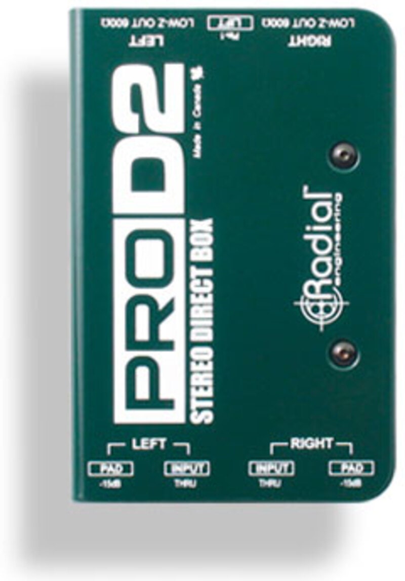 Tuotenumero 1037516Radial ProD2 on kaksikanavainen passiivinen stereo-DI-boksi, joka tarjoaa lämpimän ja luonnollisen äänen erityisesti kosketinsoittimille, samplereille ja digitaalisille instrumenteille.