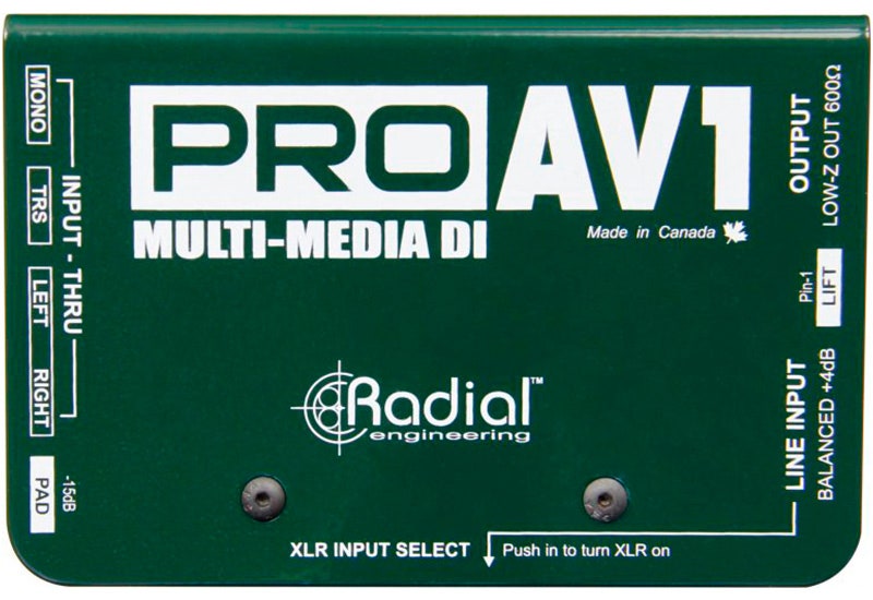 Radial ProAV1 on monipuolinen passiivinen DI-boksi, joka on suunniteltu erityisesti multimedia- ja AV-käyttöön. Se mahdollistaa lähes minkä tahansa äänilähteen liittämisen PA-järjestelmään tai tallennuslaitteistoon ja summaa stereosignaalit automaattisesti monoksi. Tämä säästää mikserikanavia ja yksinkertaistaa äänentoistoasetuksia erityisesti live-, konferenssi- ja esitystilanteissa.