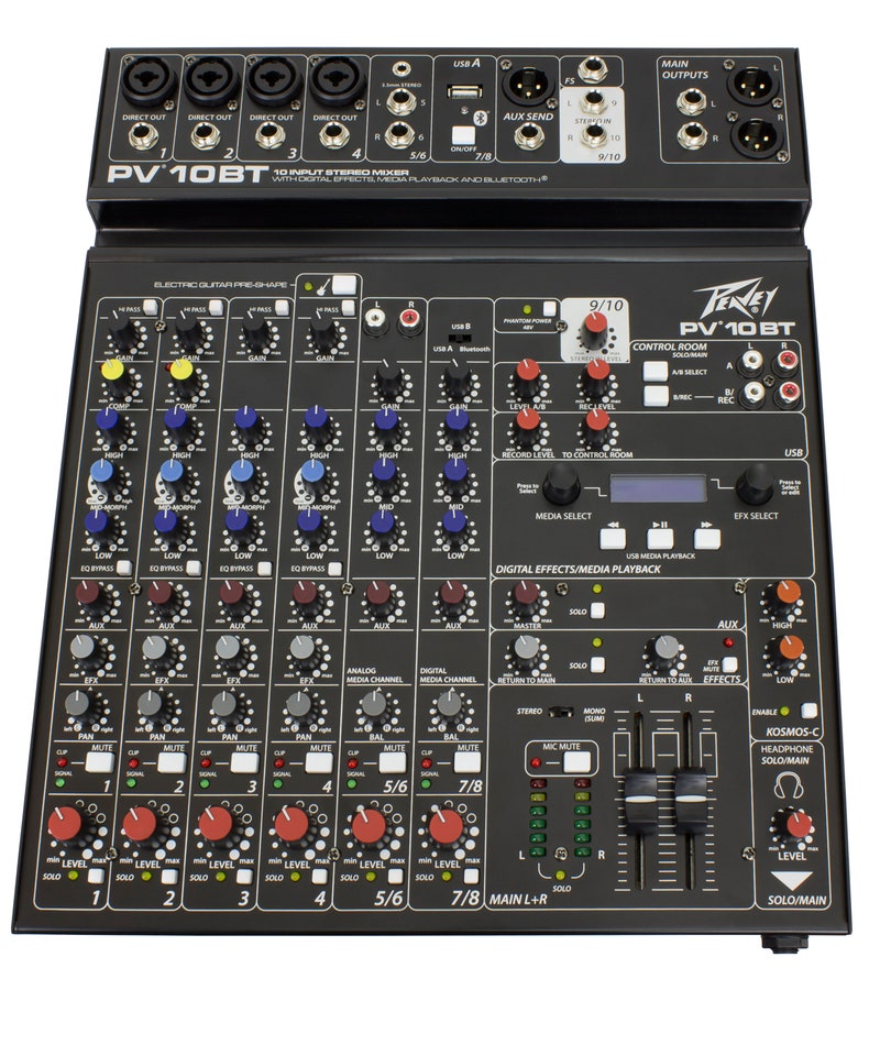 PV-10 BT:ssä on neljäi mikrofonietuastetta, kaksi direct-lähtöä äänityskäyttöön, kaksi stereokanava, langaton Bluetooth®-yhteys, korkealaatuiset digitaaliefektit, 48V phantom-syöttö, kaksi valinnaista control-room-lähtöä, stereokompressori, Hi-Z kitaraetuaste, kolmealueinen ekvalisaattori on/off-kytkimellä, signaalitason clip-ilmaisimet sekä master LED-tasomittaristo.