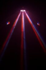 The fixture features three moving mini-bars equipped with a total of nine 12W RGBW LEDs. Each bar is mounted on a 360° rotating axis, enabling sweeping and multidirectional beam movements.