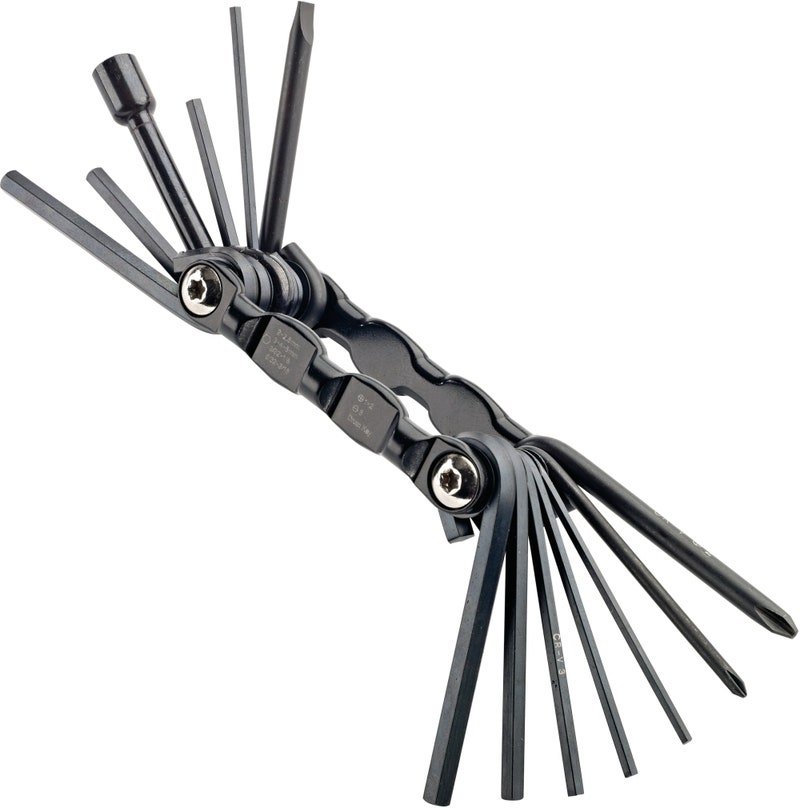 Työkalussa on seuraavat säätöavaimet: kuusiokoloavaimia tuumakokoisina (3/32"-1/8"-5/32" ja 3/16") sekä metrisinä (2mm-2,5mm-3mm-4mm ja 5mm). Mukana on myös viritysavain, kaksi ristipääruuvimeisseliä (Philips 1 ja 2) ja 5mm talttapäinen ruuvimeisseli.