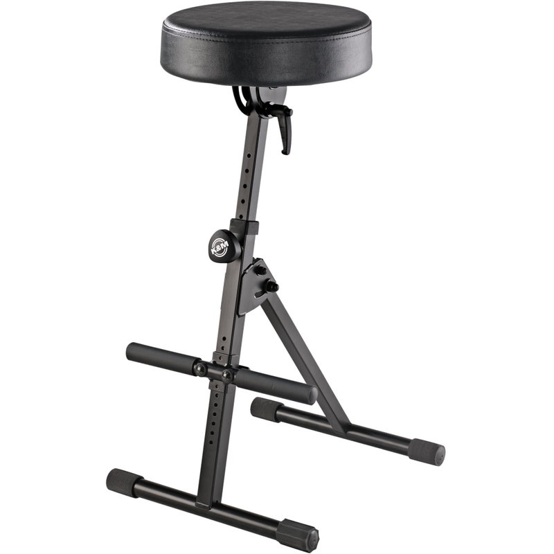 Tämä tukeva soittotuoli tarjoaa riittävästi tukea selällesi olitpa sitten kitarasti, kosketinsoittaja tai orkesterisoittaja. Keinonahkalla päällystetty istuin voidaan säätää portaattomasti mihin tahansa kulmaan. Istuimen korkeus on säädettävissä 645mm-925mm, joten se sopii jokaiselle muusikolle ja tuolin integroitu jalkatuki on myös säädettävissä korkeutensa puolesta. Tukevan jalustarakenteen ja jalkasuojien ansiosta jakkara on vakaa ja turvallinen istua ja se voidaan taittaa litteäksi kuljetusta varten.