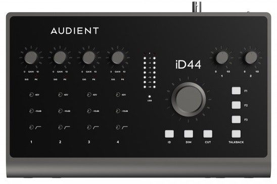Audients most powerful audio interface just got better. The latest generation of iD44 sees improved audio performance, additional must-have features and a beautiful new smoke-grey finish. The addition of audio loop-back and a dual headphone output, combined with four Audient Console mic preamps, class-leading converters, ADAT expandability and balanced inserts – means iD44 delivers the audio performance of an Audient console straight to your desktop.