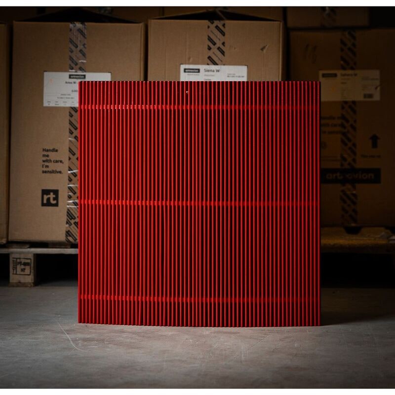 Bass trap with a very nice wooden rib front in red lacquered wood. The product has been used as a display example. The bass trap is tunable.