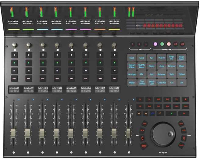 OLED-näyttö ja moderni mittarisilta näyttävät tasot, panoroinnit ja kanavavärit. Jokaiselle kanavalle on lisäksi oma 5.1 cm TFT-näyttö (DAW-riippuvainen lisätieto) ja alempi 2.9 cm TFT jokaiselle kanavalle. Suurikokoinen optinen enkooderi‑jog‑pyörä tarjoaa tarkan ohjauksen nopeaan hakuun ja aikajanan tarkkaan selaamiseen.