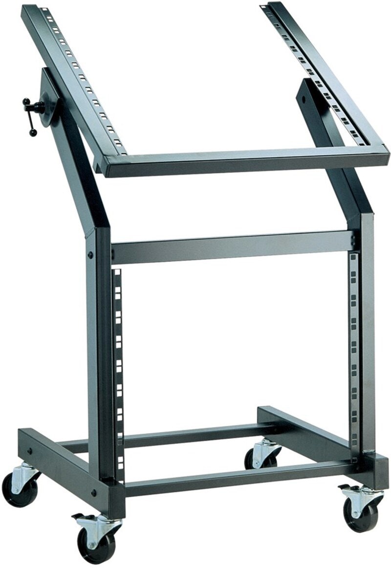 Vankka teräsrunkoinen räkkivaunu, jonka kallistuskulma on säädettävissä 45° jousikuormitteisella lukitusmekanismilla. Vaunussa on neljä pyörää, joista kaksi on lukittavia. Vaunun yläosassa on 12U laitetilaa ja alaosassa on 9U laitetilaa. Hintaan sisältää räkkiruuvit (32kpl).