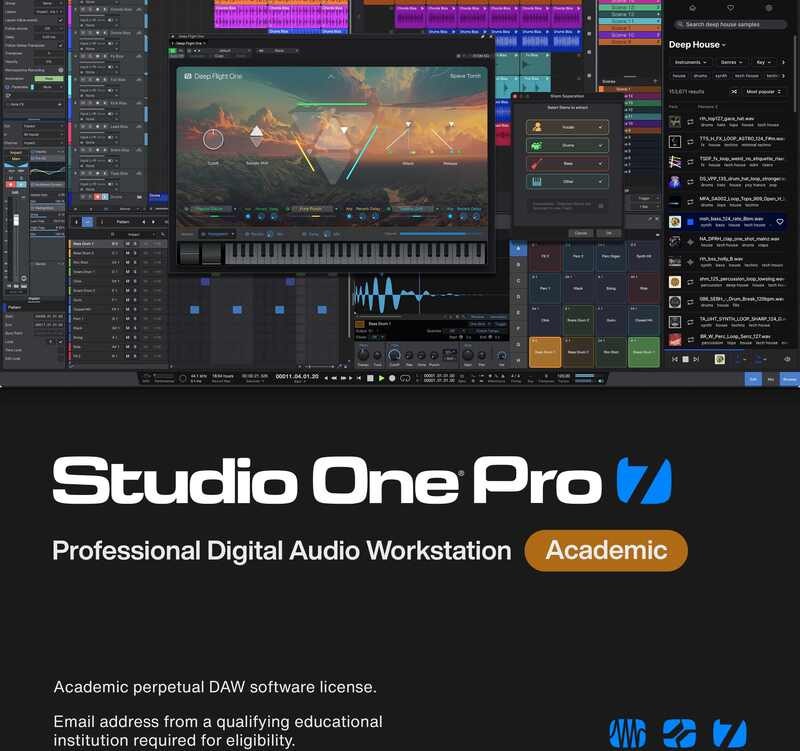 Studio One Pro 7 Academic tarjoaa opiskelijoille, opettajille ja oppilaitoksille täyden version PreSonusin ammattitason digitaalisesta äänityöasemasta (DAW). Tämä koulutuslisenssi kattaa samat ominaisuudet kuin kaupallinen versio ja soveltuu musiikin tuotantoon, miksaukseen, masterointiin, säveltämiseen ja live-esityksiin. Käyttö edellyttää opiskelijastatuksen tai oppilaitoksen todentamista.