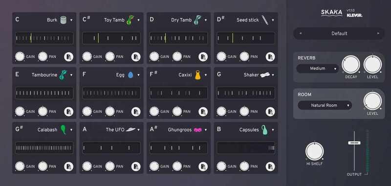 Skaka is a sample-based sequencer plugin for shaker percussion instruments. It has 12 slots, each with its own instrument, parameters (lots of them!) and pattern. We've built both the sequencer and the sampler from the ground, to optimize this instrument for these types of sounds. Each pattern contains events, with individual parameters like pitch, velocity (as in how fast the instrument is shaken), and envelope.