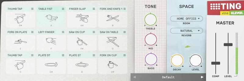 Ting is an instrument providing 28 different percussive sounds originating from everyday t(h)ings laying around at home - such as silverware, a sofa, toy drum or a pair of car keys. Each sound is carefully multi-sampled and processed with the common goal to be musically playable. Ting is intended to be a creative tool and a substitute for ordinary drum and percussion instruments. Altogether ~1500 individual samples are used to make this instrument.