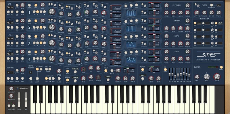 Sines is a sensational and innovative original polyphonic synthesizer. Employing four sine-wave oscillators, Sines utilizes diverse waveshaping methods to bend these pure waveforms into infinitely variable and complex shapes. When combined with its wide-ranging modulation capabilities and effects, users can create a distinctive array of unique timbres ranging from the sublime to sizzling.