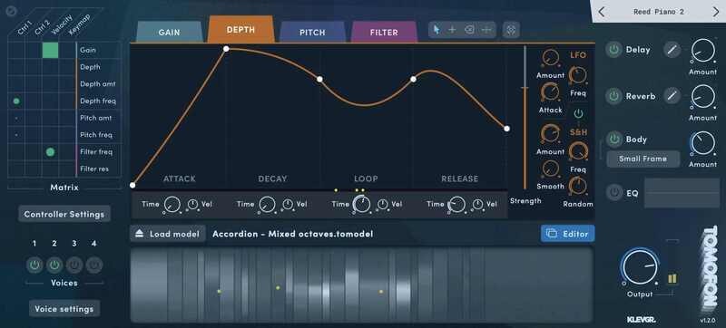 - Modulation matrix (2 x MIDI CC, Velocity and Keymap)