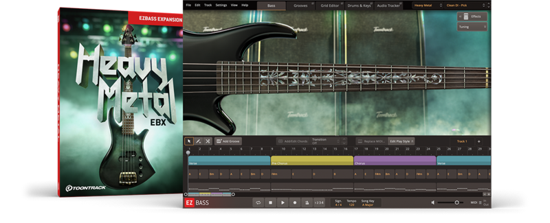 Toontrack EBX Heavy Metal on EZbass-ohjelmiston laajennus, joka tuo käyttöösi modernin huippuluokan basson soundin. Tämä laajennus on suunniteltu erityisesti raskaan metallin tuotantoon, kattaen tyylit 1970-luvun alusta nykypäivään. Se tarjoaa laajan valikoiman presettejä ja MIDI-kirjaston, jotka on räätälöity klassisesta lämpimästä soundista moderniin kirkkaaseen ja säröiseen äänimaailmaan.