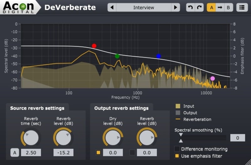 - Manual mode for music and other signal types with adjustments of the original reverberation’s level and decay times
