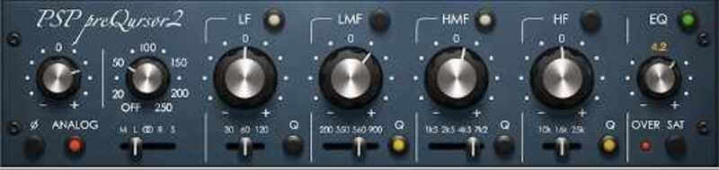 PSP preQursor2 offers PSP’s uniquely designed filters with low resonance peaks for reduced ringing artifacts, enhanced band separation, and narrow notching when attenuating signals. All four filters are bell-type filters when boosting, and have progressive Q factors