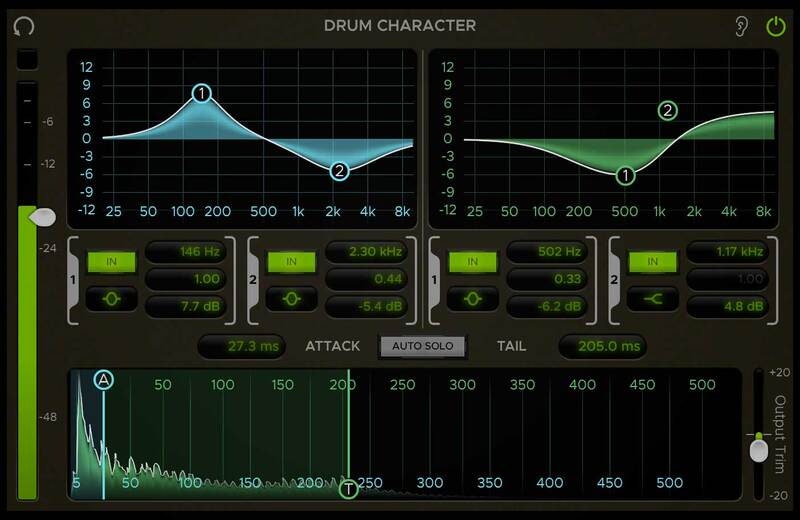 - Drum Character: A unique equalizer that detects drum hit transients and allows for the attack and tail sections of the envelope to be EQ'd individually.
