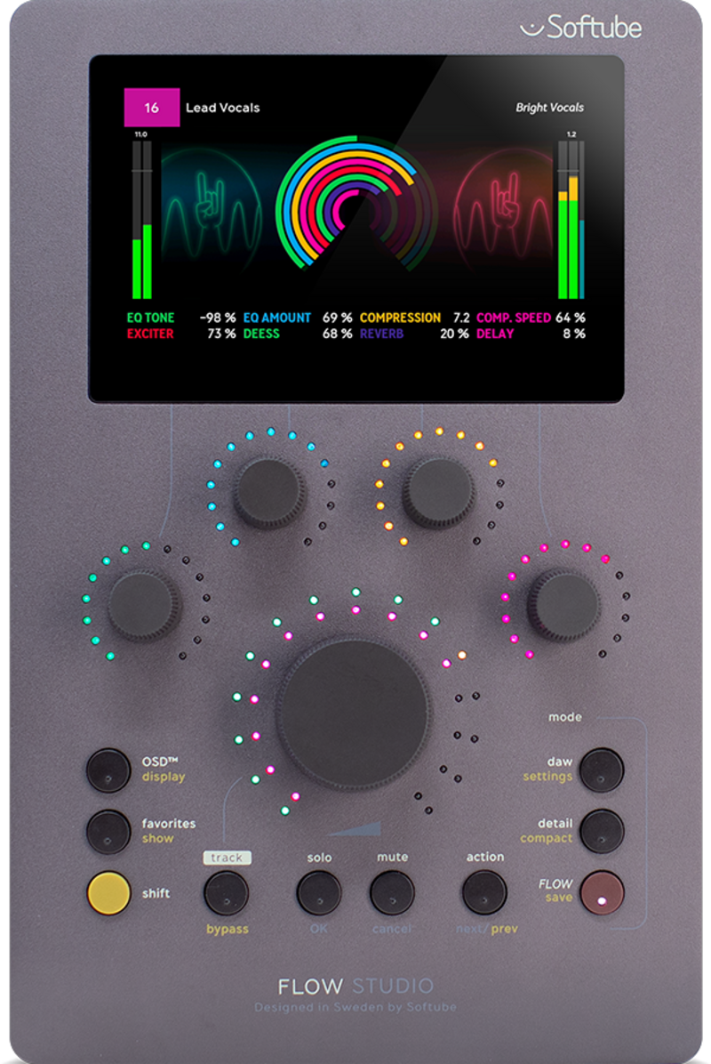 Flow Studio on suunniteltu nopeaan ja intuitiiviseen käyttöön. Kosketusherkät Analog Feel -säätimet tarjoavat tarkkaa ohjausta ja luonnollisen käyttökokemuksen, kun taas RGB-valaistus helpottaa toimintojen hahmottamista eri tilanteissa. 10,9 cm:n korkearesoluutioinen näyttö tuo näkyviin hyödyllisiä visualisointeja, kuten EQ-käyriä, kompressiota, mittareita ja muuta tuotantoa tukevaa grafiikkaa. Näin tärkeät tiedot ovat helposti nähtävissä suoraan ohjainpinnasta.