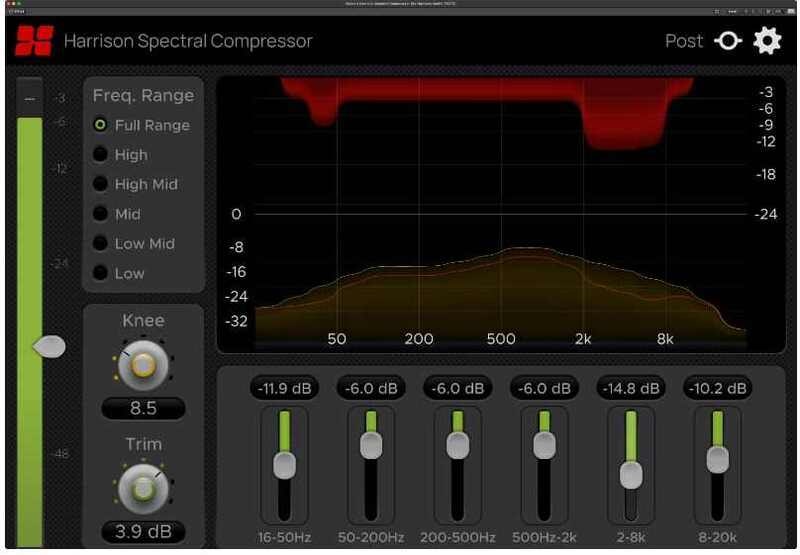 The Depth sliders below the graph control the maximum amount of gain reduction that can be applied to the corresponding frequency bands determined by the current Range setting. The Range can be set to focus on specific areas along the frequency spectrum (Low, Mid, High, etc.), or it can be set to Full Range mode to allow control over the entire spectrum. The Threshold sets the input signal level where the overall compression begins to take effect. Additional controls include compressor Knee and output Trim.