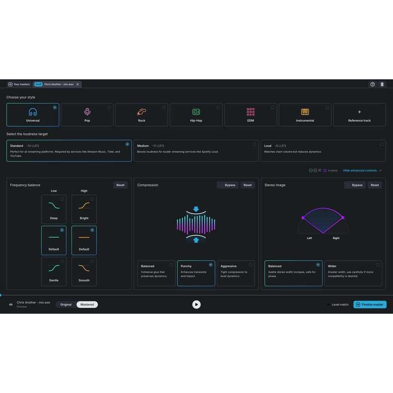 - Shape your sound with advanced fine-tuning tools, including Loudness Targets, Compression, and Stereo Imaging