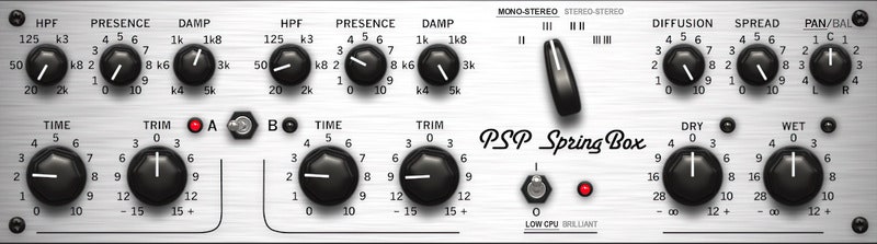 PSP AUDIOWARE BlackFriday Until December 5PSP SpringBox is an emulation of a hardware spring reverberator. It recreates several features typical of a spring reverb such as the characteristic “boing” on transients, and a repeatable resonating musical character with an adjustable presence.