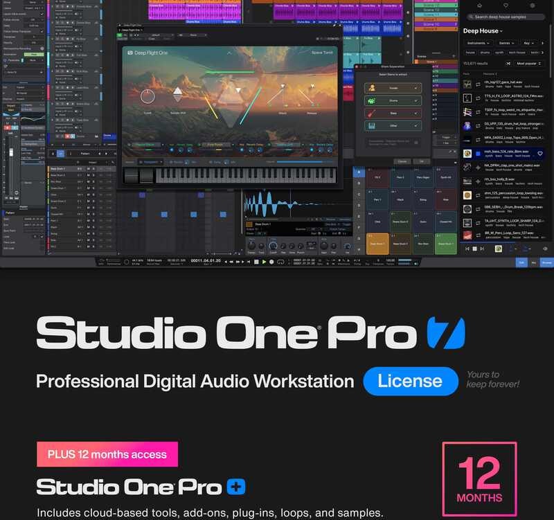 PreSonus Studio One Pro 7 yhdistettynä 12 kuukauden Studio One Pro+ -tilaukseen tarjoaa ammattitason kokonaisuuden musiikin tuotantoon, säveltämiseen, miksaamiseen, masterointiin sekä live-esityksiin. Saat käyttöösi huippuluokan työkalut ja jatkuvasti päivittyvän sisällön, joka tekee työskentelystä inspiroivaa ja tehokasta.