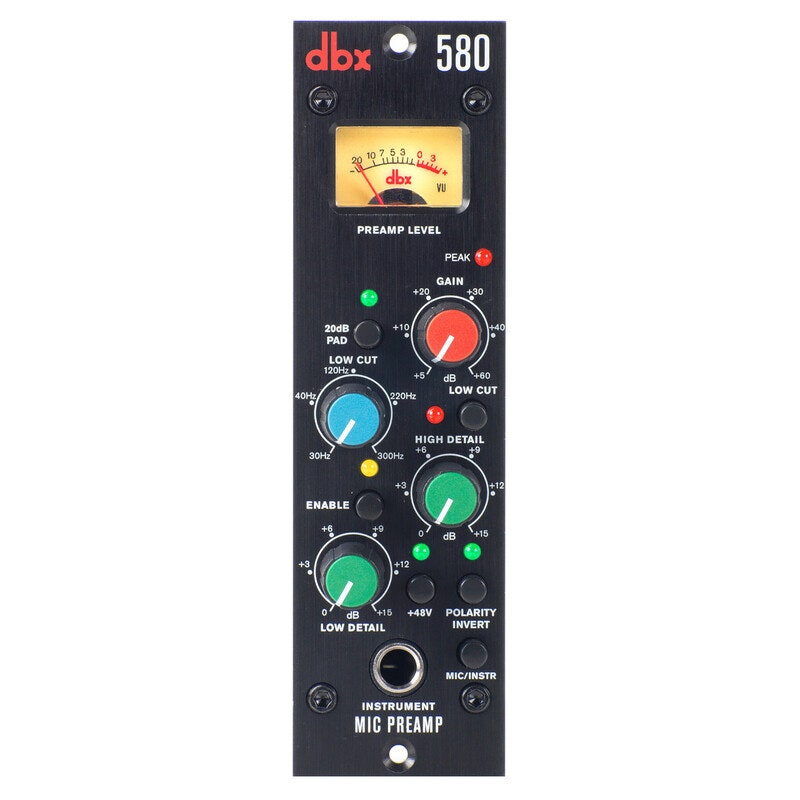 With its modular 500 Series design, the dbx 580 delivers up to 60dB of gain, features a variable-frequency Low-Cut Filter and unique Low and High Detail Equalization Controls, a 20dB Pad, Polarity Invert, +48V Phantom Power, a Front Panel Instrument Input, VU Metering and Peak Indicator.