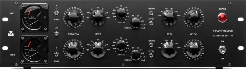 The V8 compressor is built only with discrete components and six IGS Customs transformers (three per channel). The element responsible for the compression is the bridge, composed of 4 matched pulse diodes. A device is a dual-mono unit with the option of linking the sidechain circuitry. All controls are stepped, for channel matching and recall.