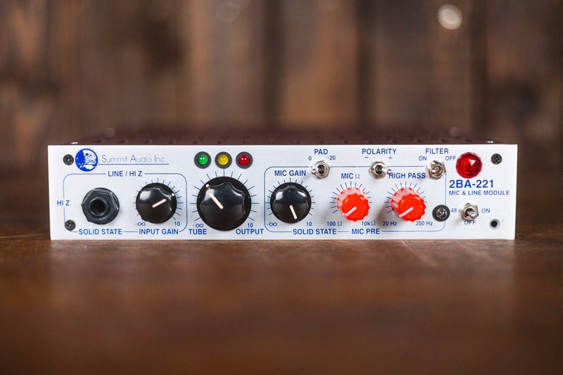 The Summit Audio 2BA-221 combines tube and solid-state technology with separate signal paths and high-quality components. A dedicated power source drives the 48V phantom power without drawing current from the main circuits.